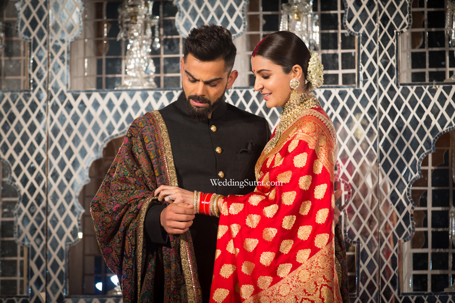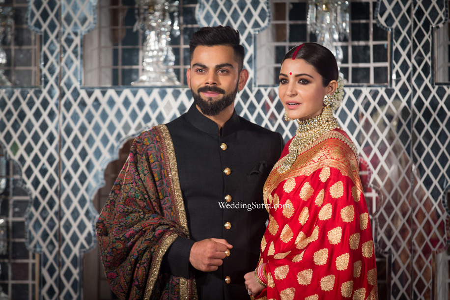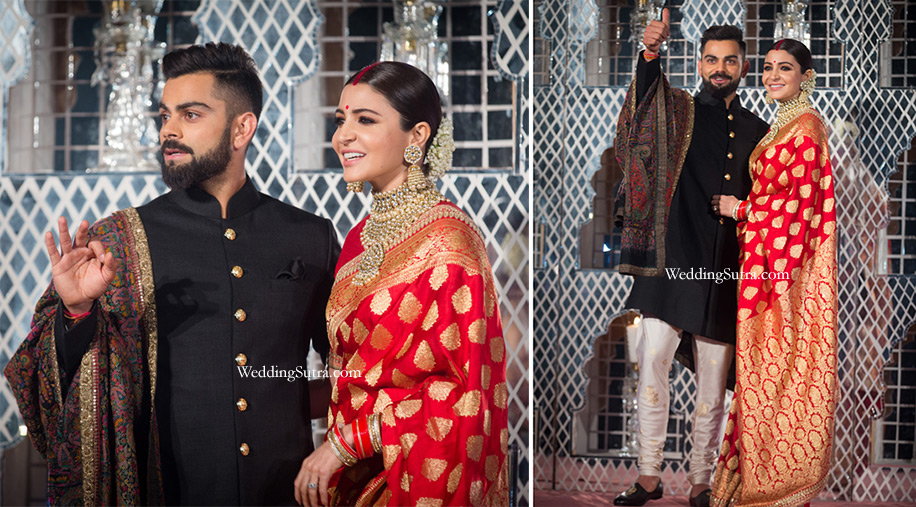 Anushka wore a red Benarasi saree inspired by the Peeli Kothi in Benaras and a heritage uncut diamond choker and jhumkas from the Sabyasachi Bridal Jewelery collection. Virat complemented his bride in a very subtle and elegant manner. He wore a black textured silk signature Bandhgala and teamed it with a white silk kurta with hand woven brocade churidaar.