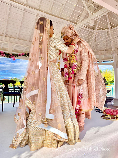 “The next morning saw all the guests dressed up in ethnic ensembles and prepare for the baraat which was quite a sight with Disney entertainers as part of the procession as well as a special appearance by the famous artist Juggy D who led the baraat with groom Varun in a classic Cadillac. The wedding ceremony was held at the Pier of Newport Bay Hotel overlooking the lake.”