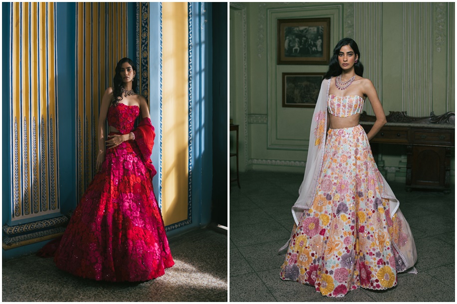 Beloved for their signature 3D floral motifs and sumptuous embroidery, Mishru lehengas are perfect for the whimsical bride. Their vibrant hues and ethereal designs are sure to add a touch of fantasy to your wedding day!