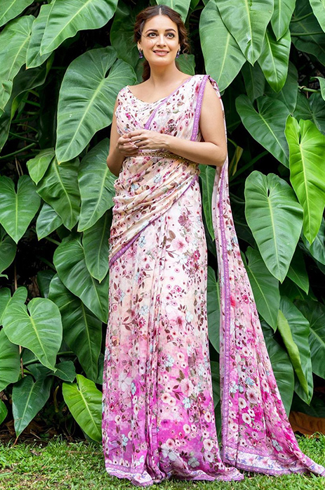 Wear a floral pre-draped saree for spring weddings just like Dia Mirza