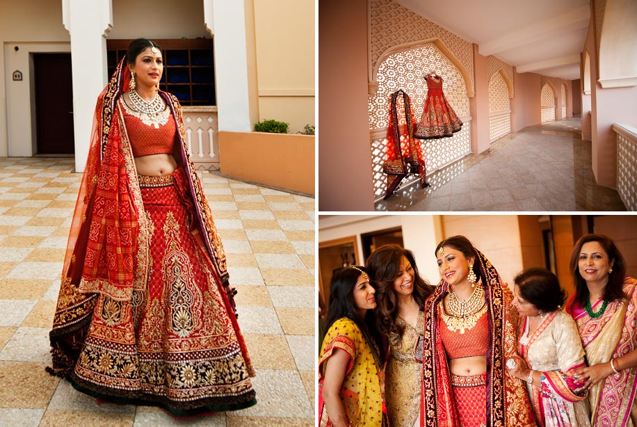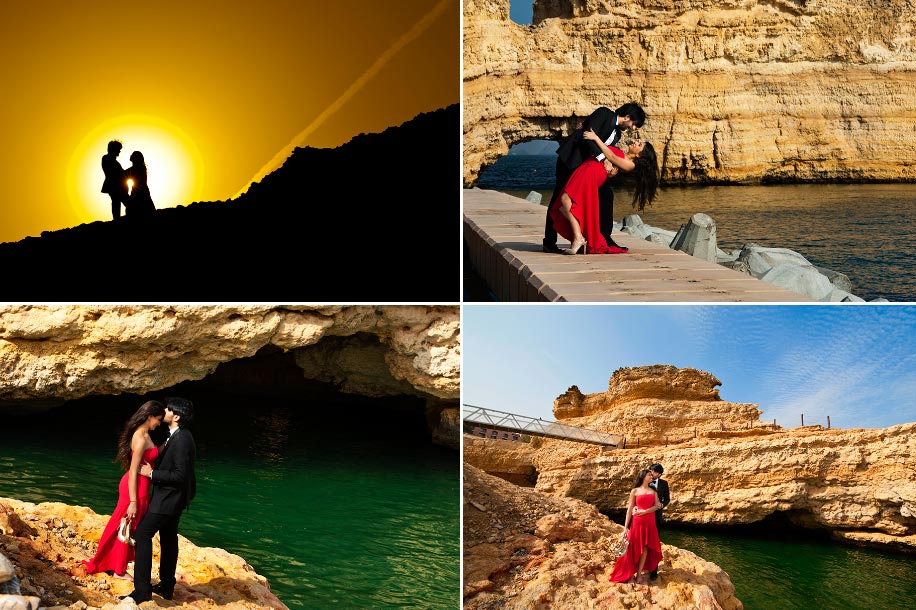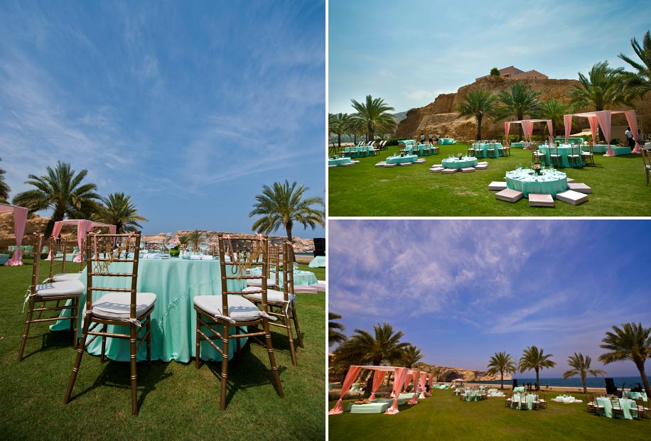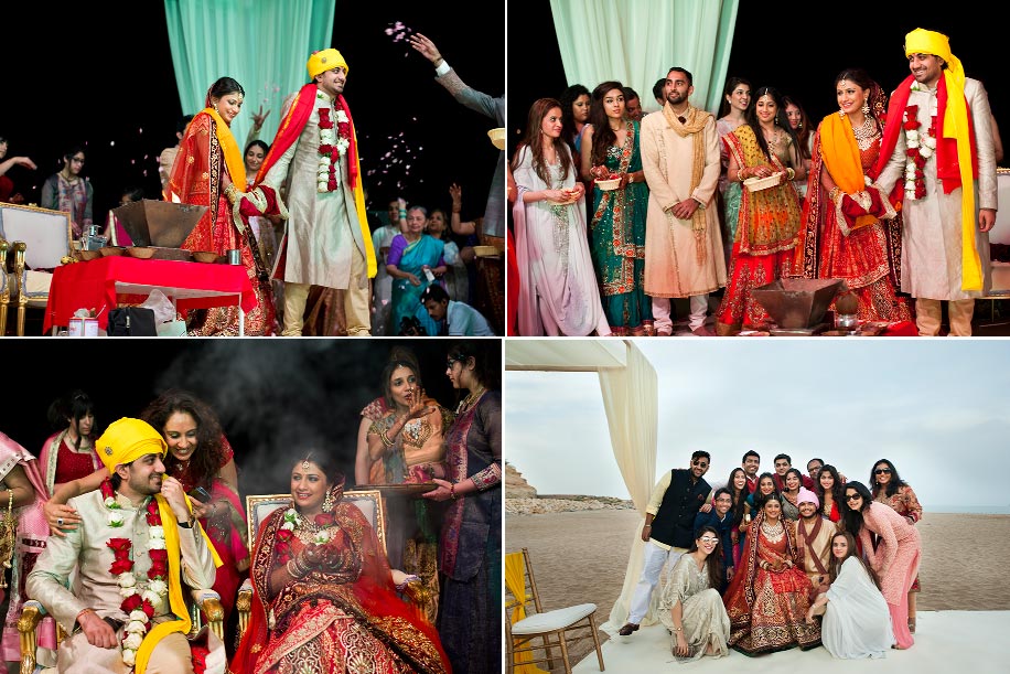 She looks regal in her red strapless gown against the brown backdrop of the sun-kissed Hajar mountains, while he appears kingly in the yellow turban he dons for the evening pheras in the aqua-draped beachside mandap. The net dupatta of her bridal lehenga is silhouetted evocatively against a latticed window, while he gets drenched by his buddies under a date palm next to the brilliant blue sea… Aditi and Jash’s wedding at the stunning Shangri-La Barr Al Jissah Resort & Spa in Muscat, in the Sultanate of Oman, was a photographer’s delight. As ace wedding photographer Parikshit Suri (www.pksuri.com) who shot their three-day wedding here says, “From pristine crystal-clear blue waters of the Sea of Oman to the dramatic, porous ancient mountains, rocky formations rising out of the sea, sandy beaches, crimson skies at sunset… the place has everything – including a Turtle Beach – where the numbers of eggs laid and hatchlings born are tracked on a daily basis.”