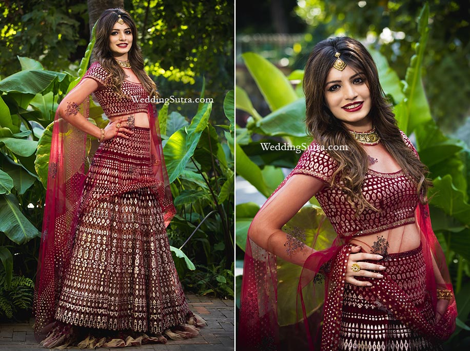 Chandni’s innate poise was enhanced by a gorgeous maroon lehenga by Tarun Tahiliani. Her striking makeup by Recinda Martis, and stunning choker, earrings, ‘maang tikka’ (forehead ornament), bracelet and rings from Azva made her a bride to idolize!