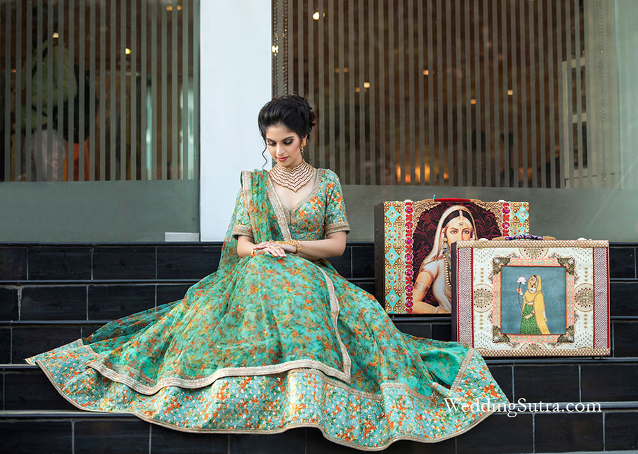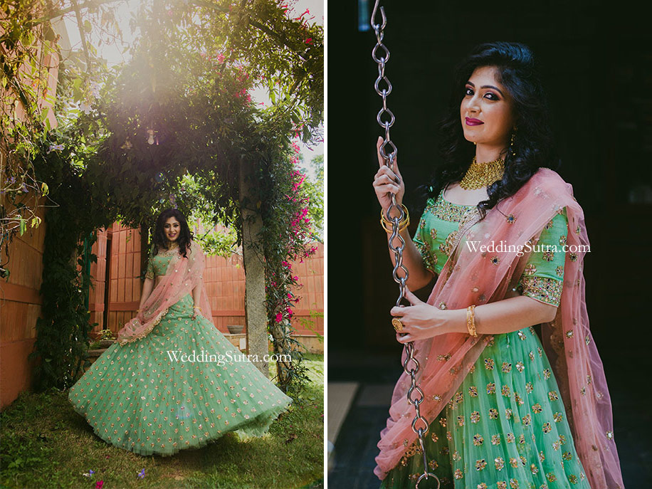 Wearing a gorgeous mint lehenga with a pink dupatta by Mrunalini Rao of Evoluzione, bespoke gold jewellery from Azva and a flawless bridal look by the makeup team at Zorains Studio, Lavina gave us serious bride goals!