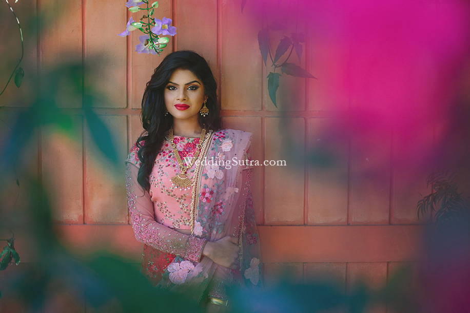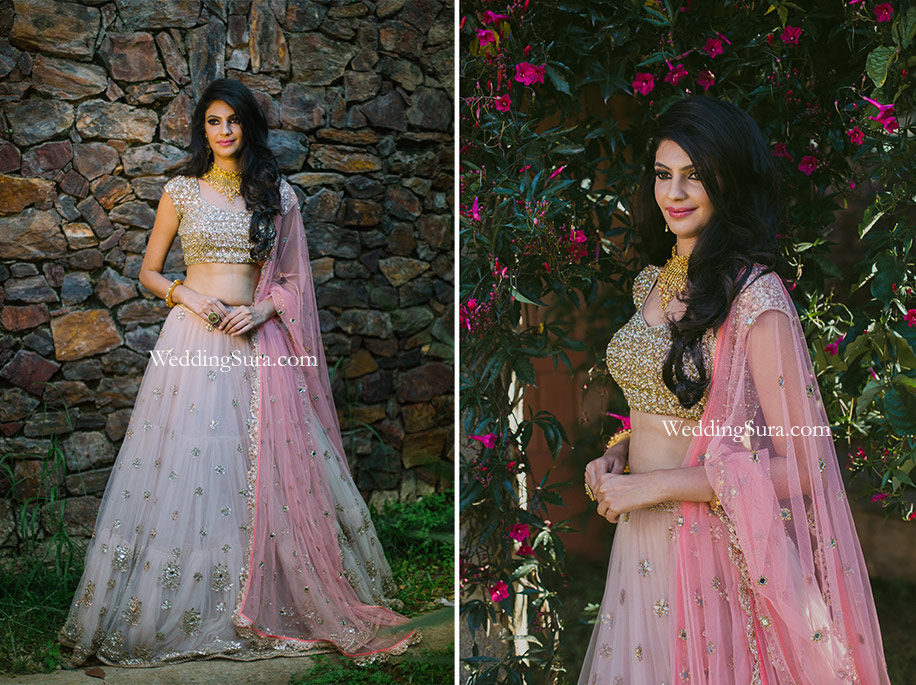 Manmeet’s choice of a stunning pastel peach lehenga and sequined blouse by Mrunalini Rao, statement necklace and matching jewellery from Azva, and a gorgeous makeover by makeup artists from Zorains Studio left us awestruck!