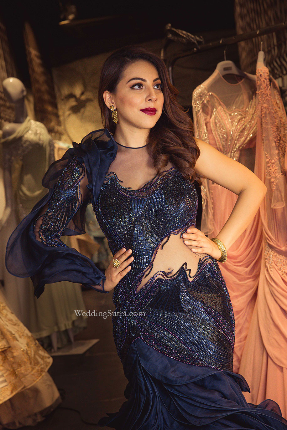 A stunning navy blue fishtail silhouette gown with ruffled details by Gaurav Gupta, beautiful gold earrings in a contemporary design and statement bangles from Azva, paired with dramatic makeup by the talented Lekha Shah transformed Neha into a glamorous bride.