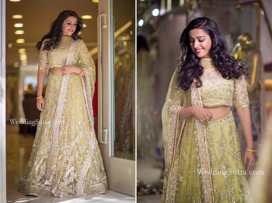 Exuding elegance and radiance in her dull yellow lehenga by Neeta Lulla, bride Ritika made for a pretty picture. Her long locks, glowing bridal look by makeup maestro Kumar Iyer who used Lakme Absolute products, and jewellery by Azva made her a beauty to behold. Her multi-layered stunning neckpiece and chandelier-style earrings featured perfectly set kundan and gold designs.