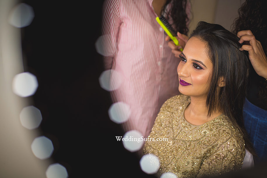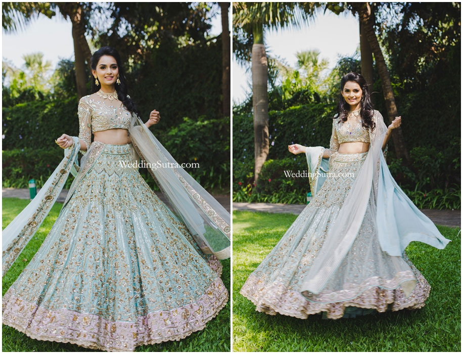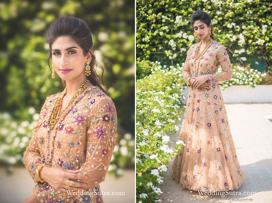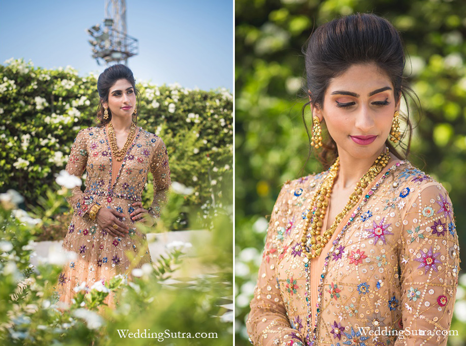 A powder blue lehenga with a baby pink border by Manish Malhotra gave Minnat a Disney princess look. Her jewellery from Rivaah by Tanishq included a neckpiece with multicolored elements, matching earrings, a floral-shaped ring and a pearly bracelet. We love how Sejal Sachnakul of Makeovers by Sejal combined shimmering copper pigments on the eyes with pink lips and a flawless blush on the cheeks that matched the girlish yet glam vibe of the ensemble.