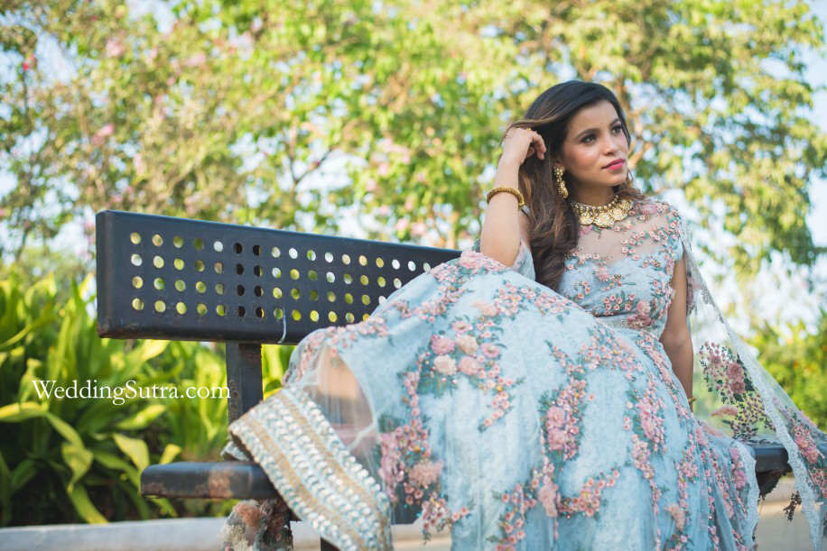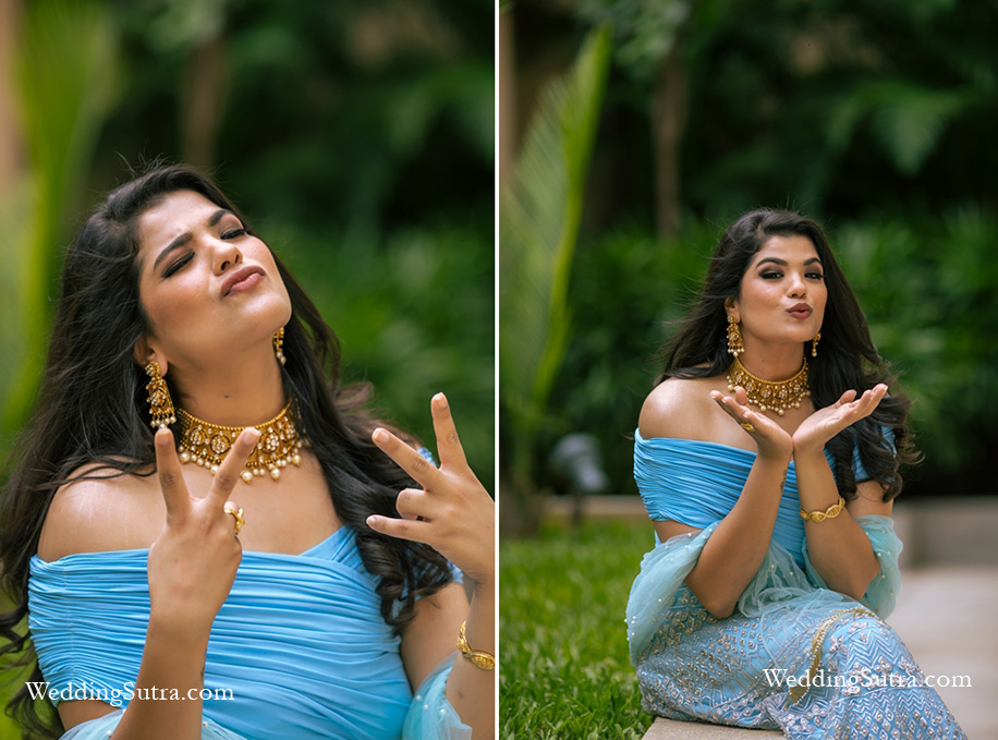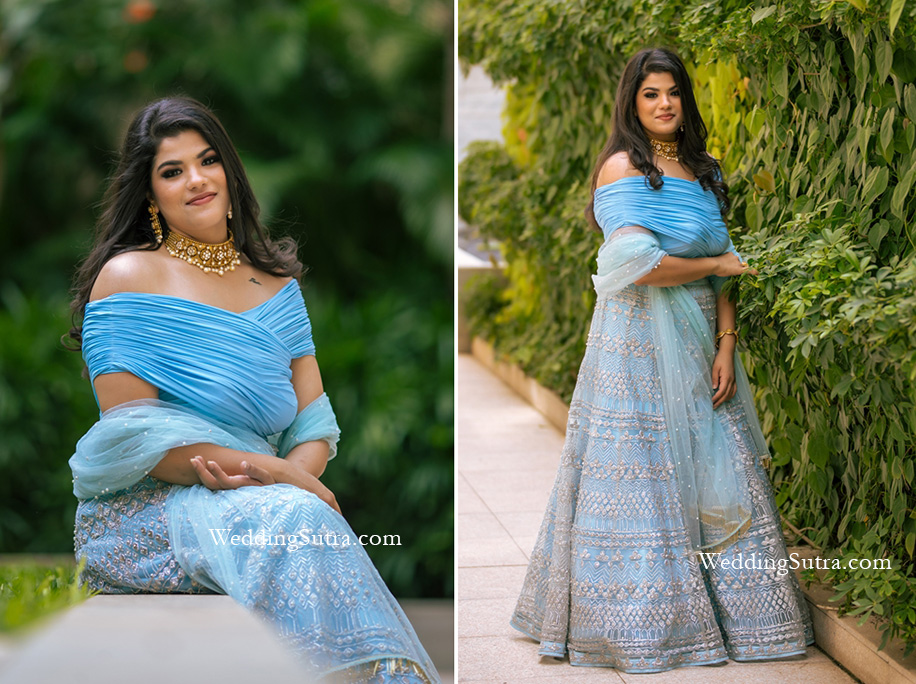 Wearing a powder blue Chamee and Palak lehenga with a unique wraparound blouse, Saloni looked cool and distinct. Her handcrafted jewellery from AZVA included pretty earrings and a slender choker with pearls dangling from the edge. The deep neckline of the blouse ensured that the choker was the center of attention. Makeup artist Sejal Sachnakul of Makeovers by Sejal highlighted Saloni’s beautiful smile with darker lips and enhanced her eyes with well-defined eyes and lashes.