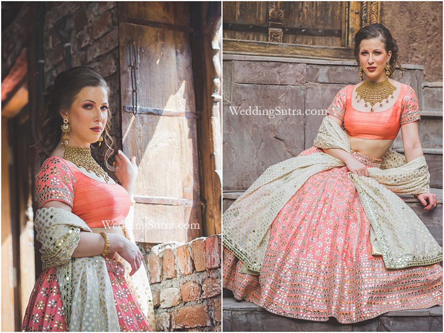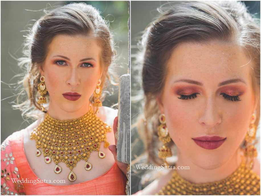 Vakare looked amazing in her peach and mint green lehenga by Abhinav Mishra. She teamed the ensemble with bespoke gold jewellery by AZVA that included a magnificent choker with seven rows to symbolize the seven vows of marriage and a pair of heavy dangling earrings. Makeup artist Pooja Khurana crafted a lovely look that brought out Vakare’s Caucasian skin tone and features and made this one of our favorite bridal makeovers of the year.