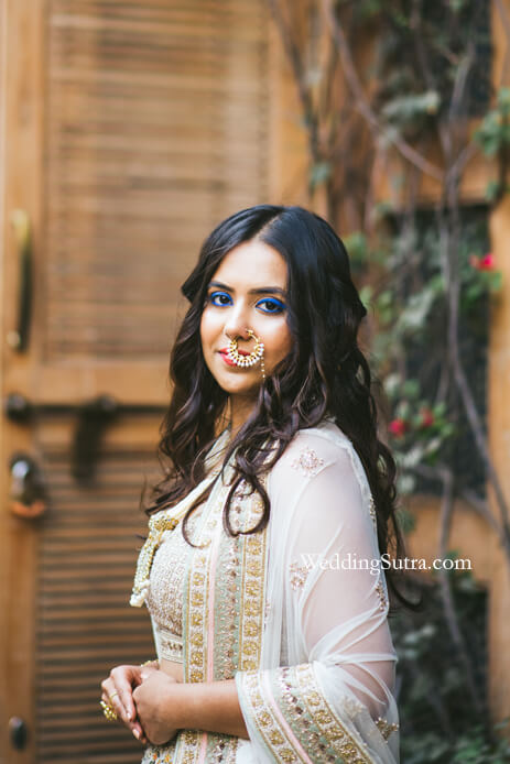 Looking ravishing wearing an electric blue on her eyes, Dhwani’s makeup by Mausam Gandhi was bold and playful. She gave the traditional red outfit a miss, instead wearing a white Izumi Lehenga from Anita Dongre’s Pichhwai Collection. Her jewelry, from Pink City by Anita Dongre, lent an ethnic allure to the entire ensemble. A statement nath was teamed with a regal haar and a delicate hathpool.