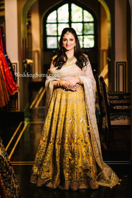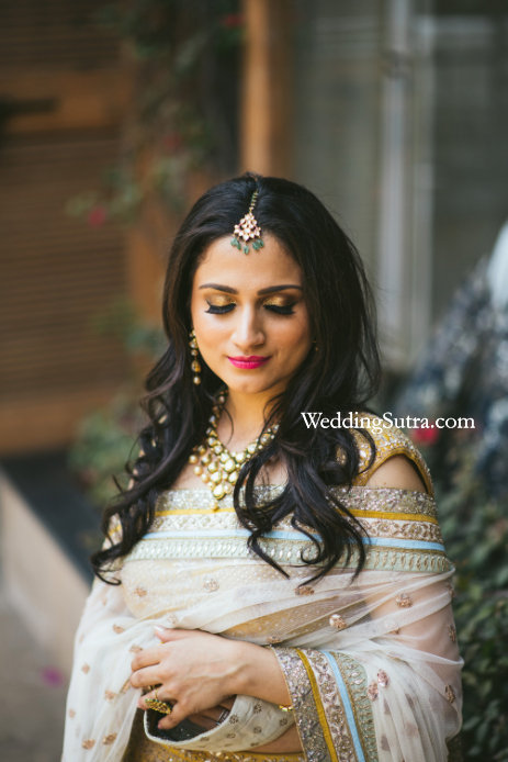The yellow Anita Dongre creation chosen for this bride-to-be Pooja, had an intricately-designed skirt and blouse, paired with a white dupatta. The bride matched this stunning attire with a gorgeous necklace set, a maang tikka, some beautiful gold kadas and a ring by Pink City by Anita Dongre. For her makeup, she chose a striking pink lipstick and gold glitter on her eyes for some added drama.