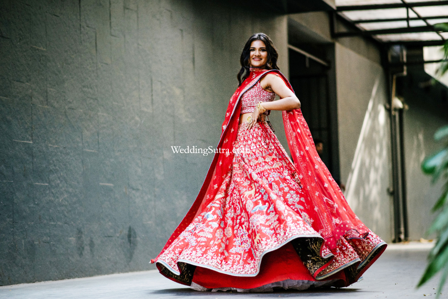 Miloni chose a red lehenga from Anita Dongre’s bridal couture capsule collection inspired by the art of Pichhwai. She paired it with stunning bridal jewellery from the Pink City by Anita Dongre range. Mausam Gandhi completed her look with makeup that included understated nude lipstick and a hint of copper on her eyelids.