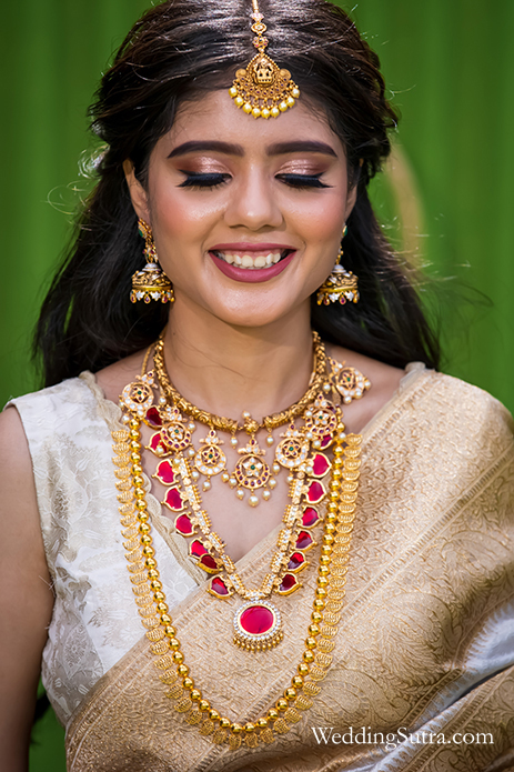 Dressed in a pristine-white traditional mundu-style lehenga from Warp ‘n Weft, Krupali was the epitome of Malayali bridal beauty. Wearing glittering gold ornaments from Kalyan Jewellers, she went for a dewy look with subtle strokes of blush. Her well-defined eyebrows and bold lips brought out her natural beauty.