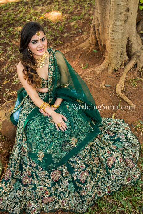 The modern-day princess, Nihali, chose a heavily encrusted emerald lehenga by Shyamal & Bhumika that she beautifully paired up with a gold and polki choker set with suspended pearl detailing, earrings and a maang tikka from Rivaah by Tanishq. Jade Green Eyes was the trend followed for Nihali’s makeup, and she kept her skin fresh with a subtle glow on my face and nude shade on her lips.