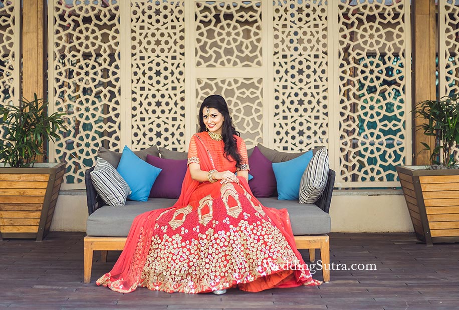 Sneha Bhandari’s poise was enhanced by the intense orange of her Ridhi Mehra Lehenga from Aza Fashions. Amrita Sanghavi’s fresh Lakme Absolute Makeup and Gehna Jewellers’ Jadau Jewellery all came together magnificently to make Sneha a bride to idolize!