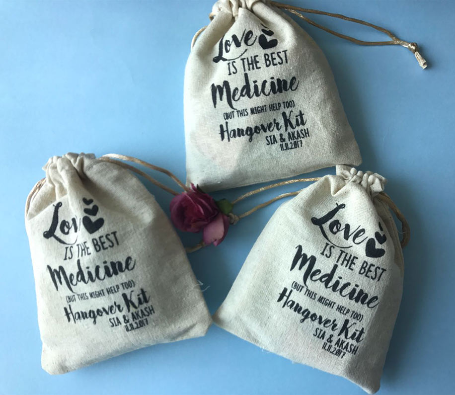 It’s a wedding. There will be hangovers. Hangover kits from Wedding Lounge are definitely a favorite in the hamper. Your guests will appreciate a few goodies to help recover from your epic celebrations.