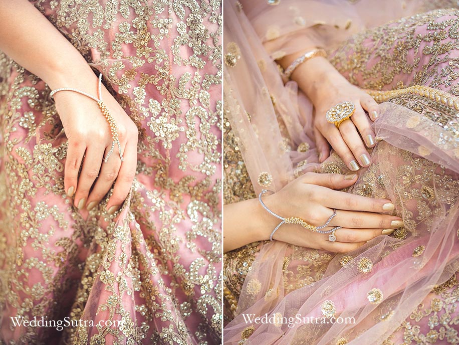 An intricately designed palm bracelet studded with diamonds set in 18kt gold is sure to make a statement at your wedding festivities.