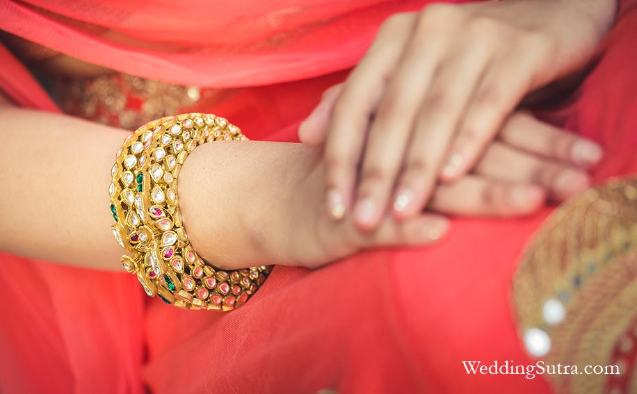 Statement bangles are in and this gold kada from Gehna Jewellers studded with kundan and coloured kundan set in 22kt gold is a real stunner.