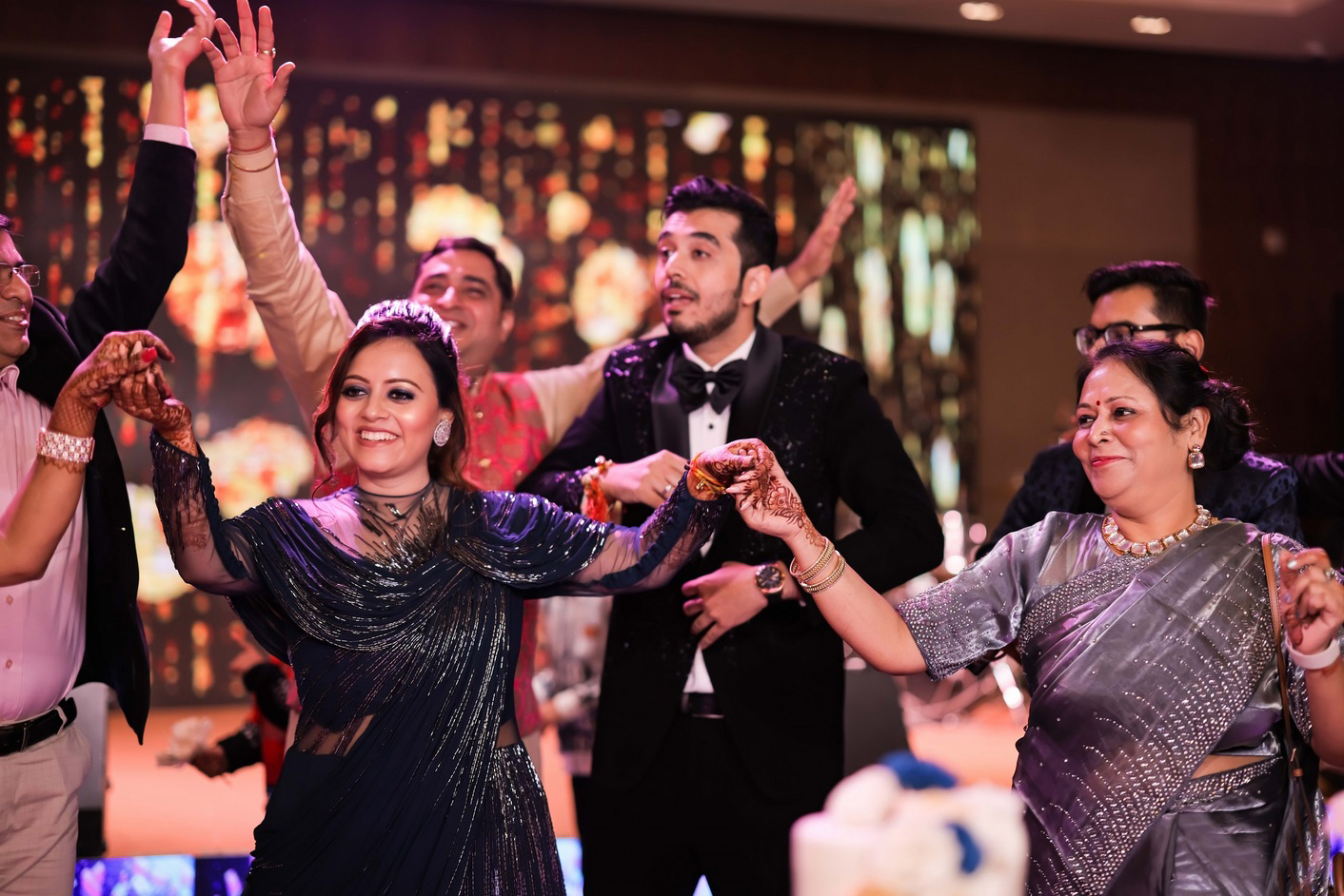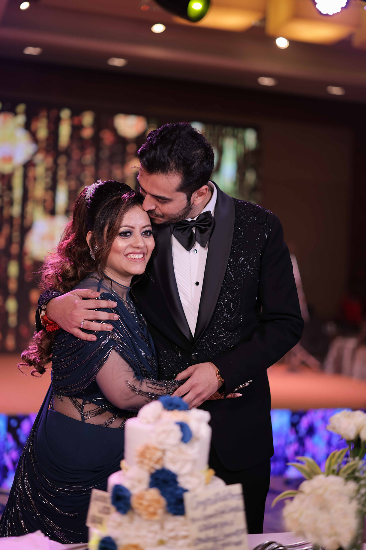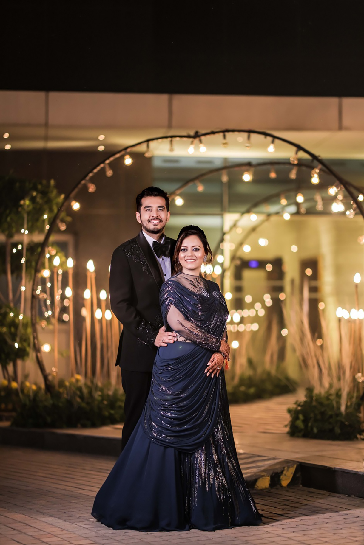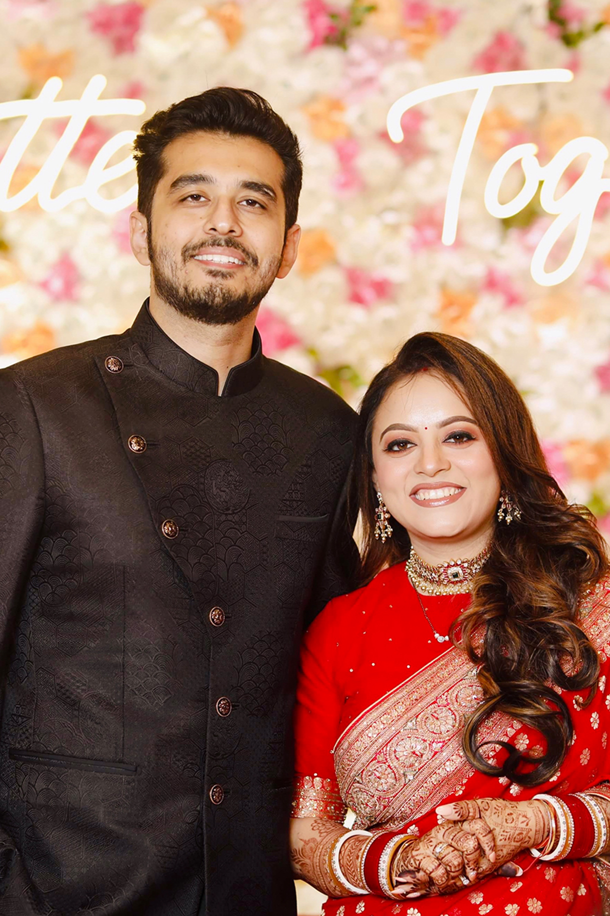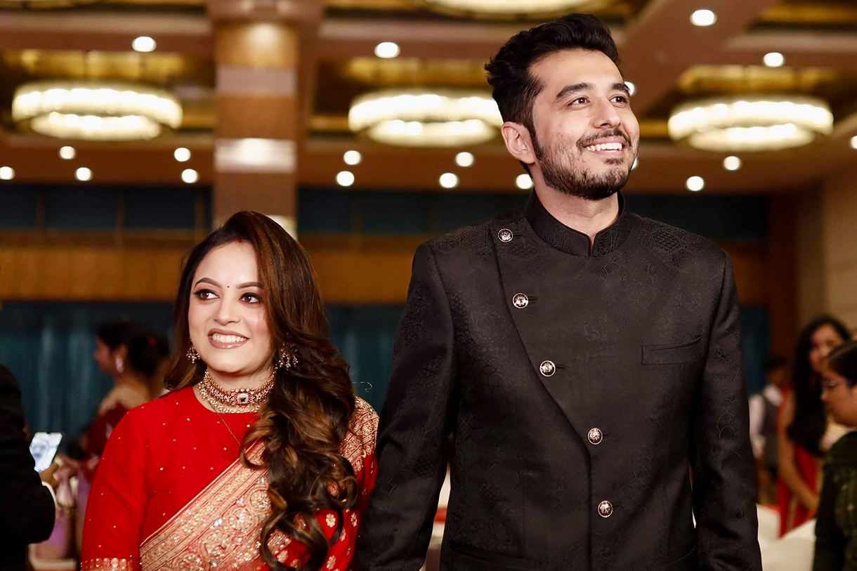 Hosted indoors, the reception was a glamorous night as the couple celebrated the beginning of their new adventure with their loved ones. Clad in a beautiful red saree, the bride looked stunning while the groom contrasted her in a black suit.