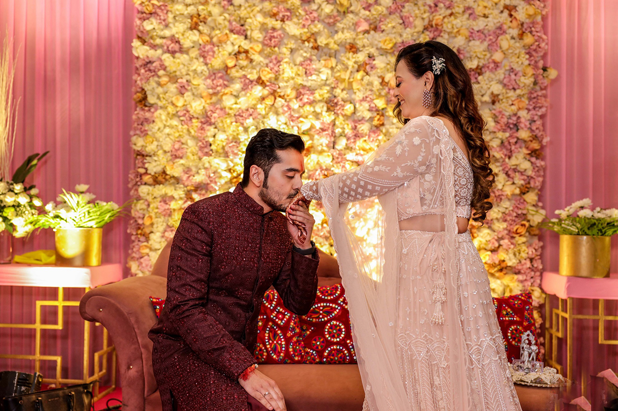 Flaunting simple floral decor, the engagement gave dreamy vibes. Flanked by a floral wall, the couple looked stunning as they exchanged rings!