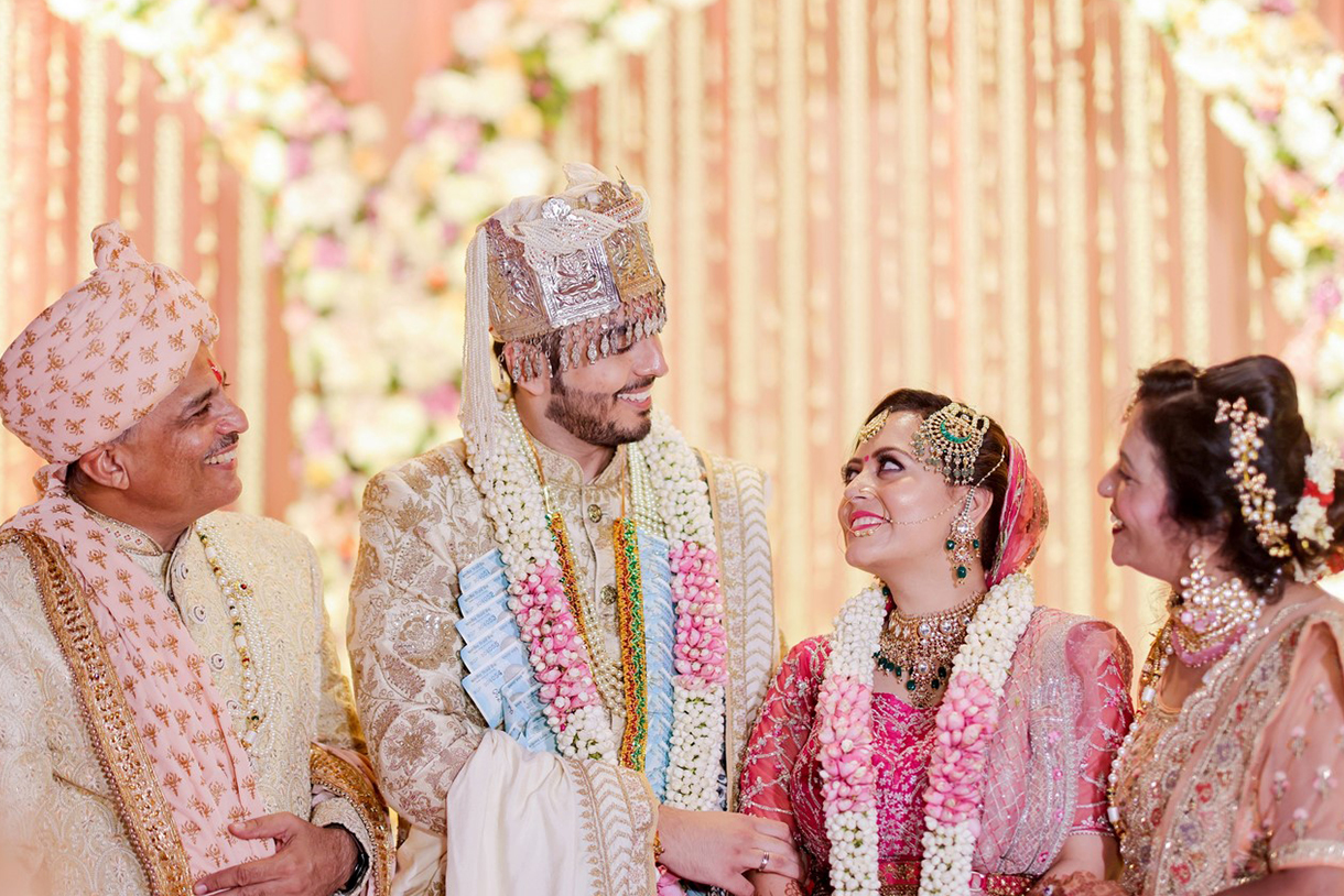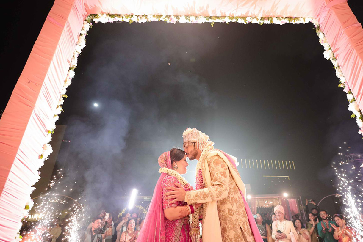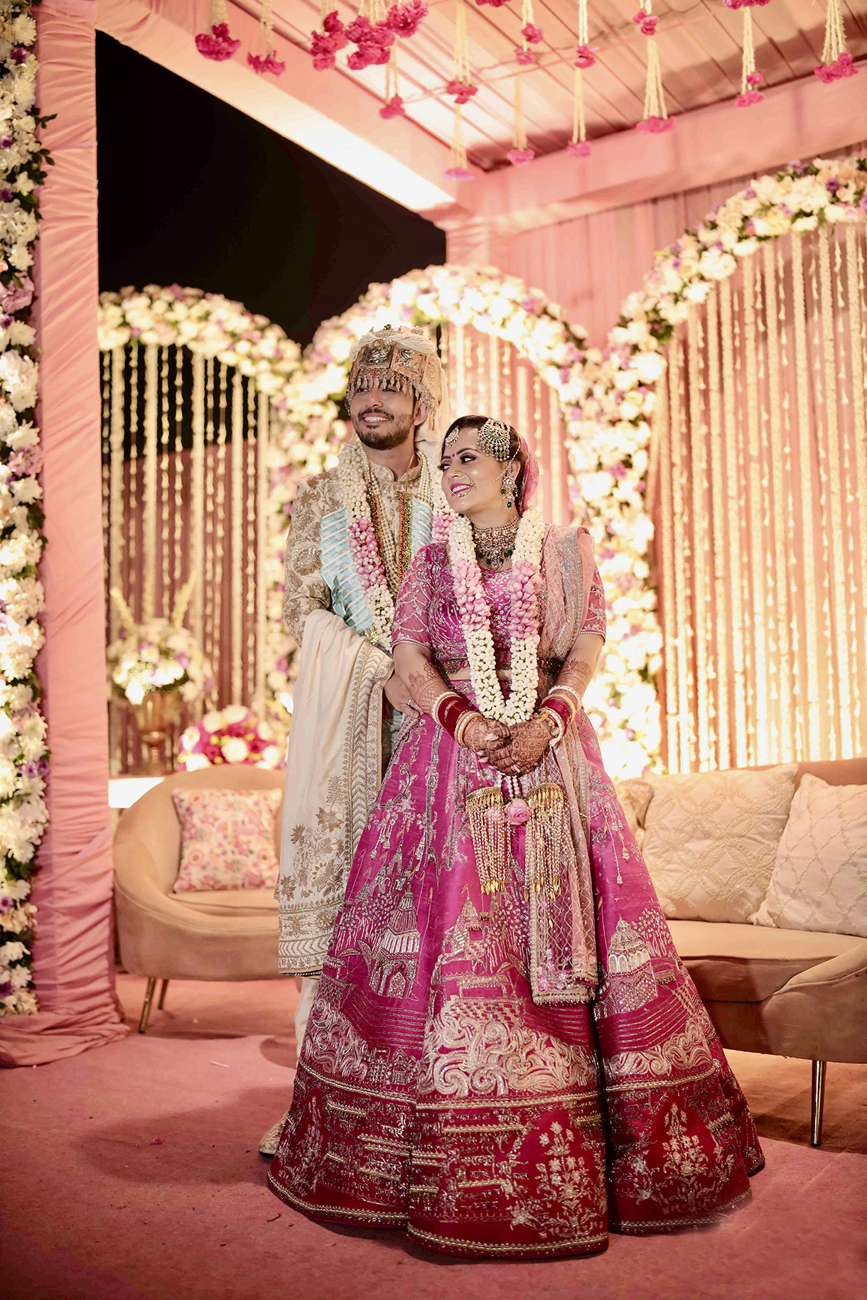 Naina shares, “We continued the theme of our wedding outfits staying in sync with the decor for the wedding too. The pink and white wedding stage was perfectly in line with our wedding wear. Floral arches, crystals and flowy white drapes made the entire experience so dreamy! Our mandap was also nothing less than perfect and exactly how we both imagined it to be.”