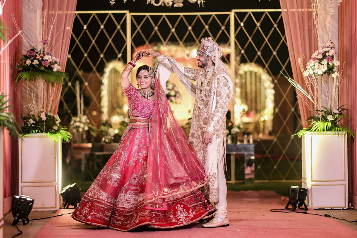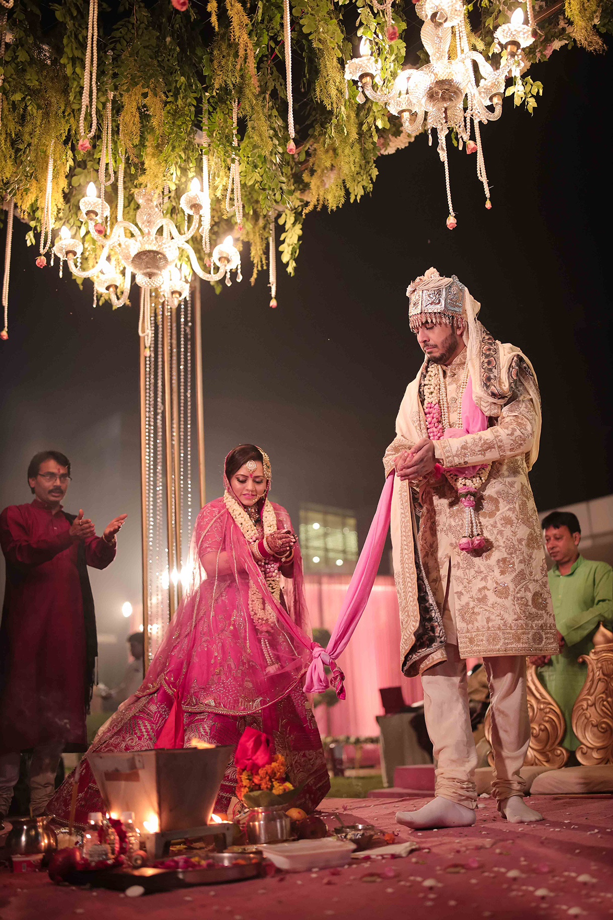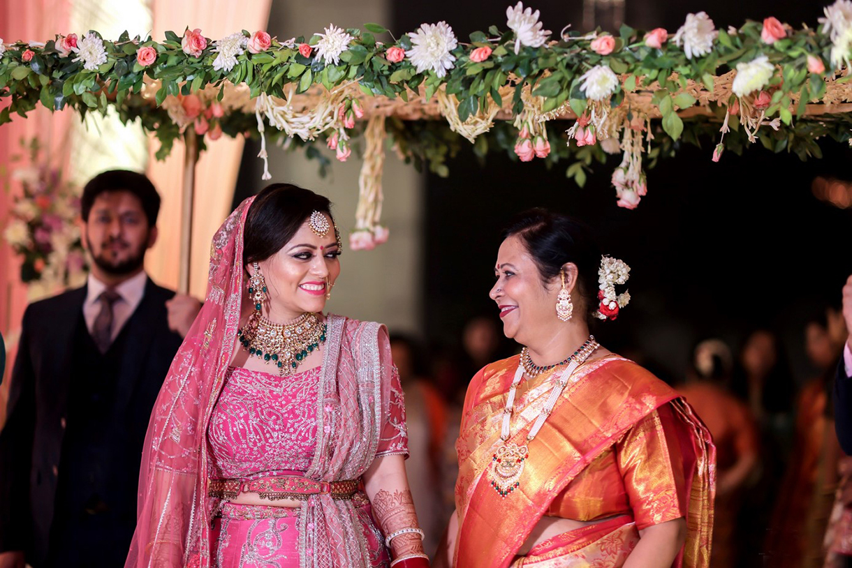 Naina shares, “We continued the theme of our wedding outfits staying in sync with the decor for the wedding too. The pink and white wedding stage was perfectly in line with our wedding wear. Floral arches, crystals and flowy white drapes made the entire experience so dreamy! Our mandap was also nothing less than perfect and exactly how we both imagined it to be.”