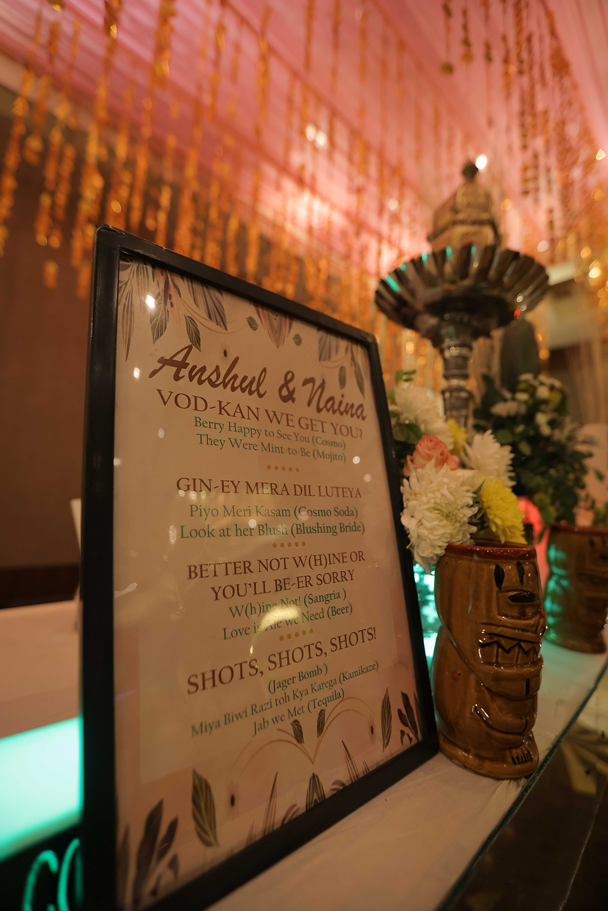 Naina shares, “One of our main functions was Sangeet/Cocktail where we had a molecular bar and elegant decor with a big stage for performances! We chose white and gold as the color palette and it was in perfect tandem with our outfits.”