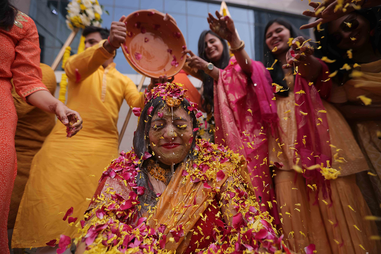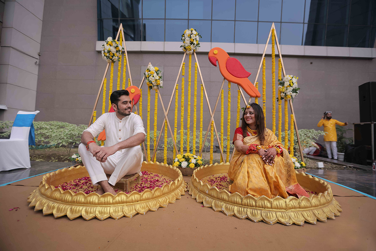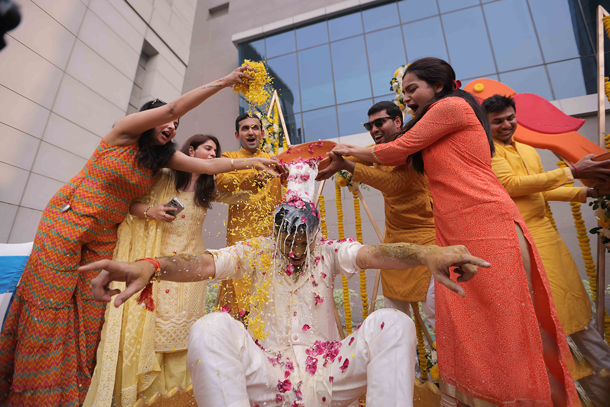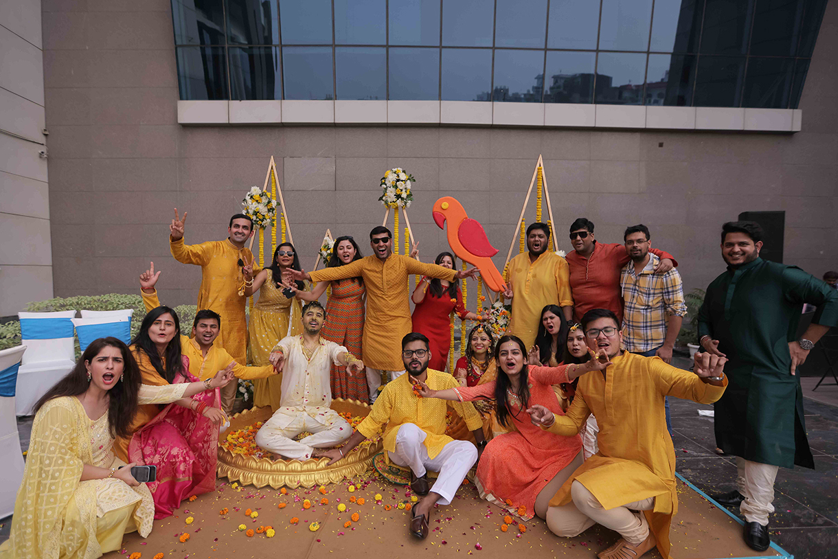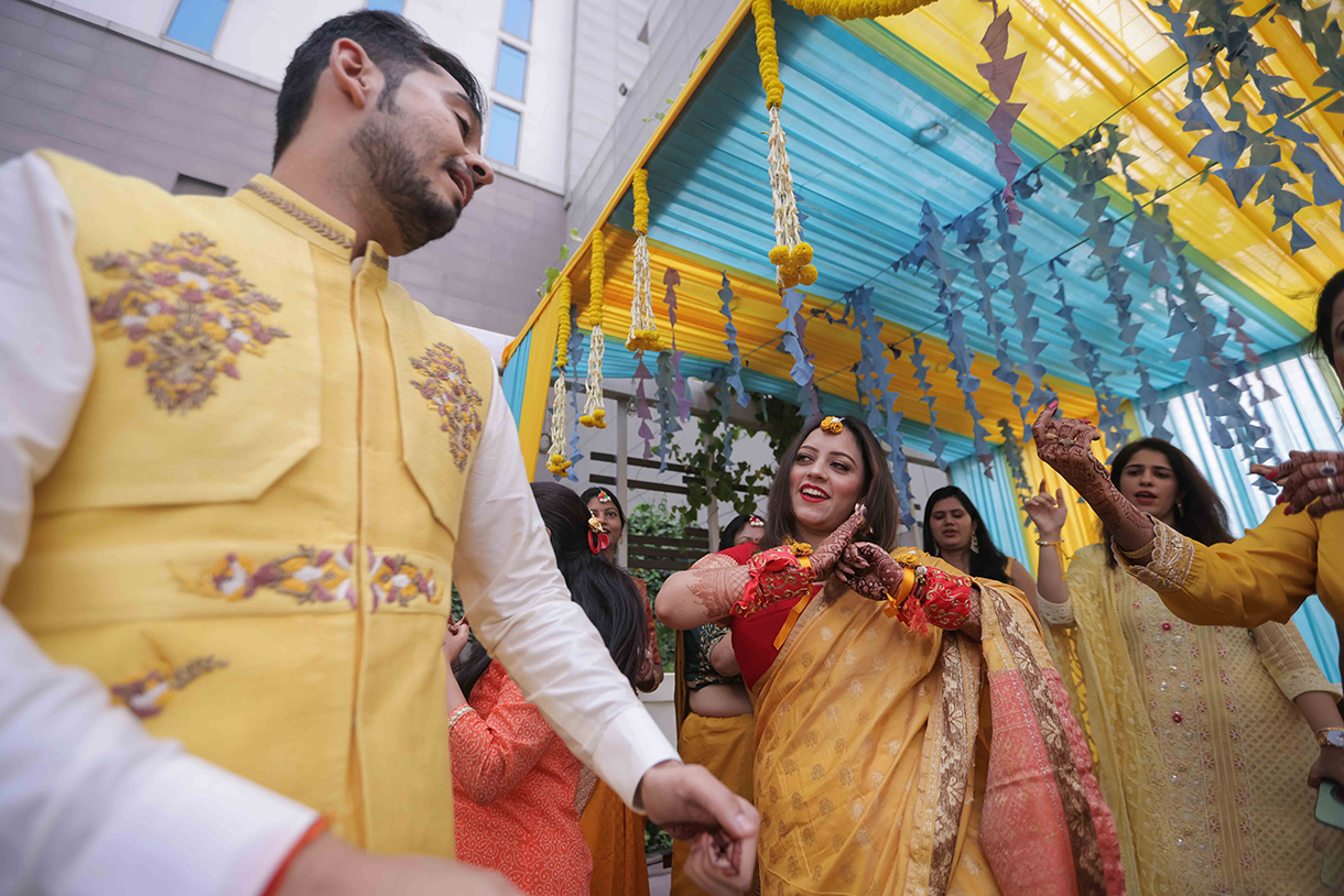 Colorful and vibrant décor with family and friends dancing on dhol, haldi was a totally fun-filled affair.