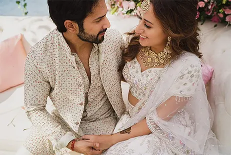 Designer Natasha Dalal married beau and actor Varun Dhawan in an intimate setting attended by a small gathering of close friends and family in Alibaug on January 24, 2021. The couple shared some unseen moments from their mehendi and we love their choice of color palette for the intimate ceremony. Varun’s white kurta and bandi set with multi-coloured bead work was custom made by Kunal Rawal. Natasha designed her own subtle-hued look that is not only elegant but also a practical addition to any bride’s trousseau. Her ivory lehenga was embroidered with gold florals and pastel pink and lilac motifs with crystal tassels on the sleeves, and a scallop-edged sheer dupatta. She accessoried her look with a statement gold necklace, jhumkas and maang tikka with pastel pink stones.
