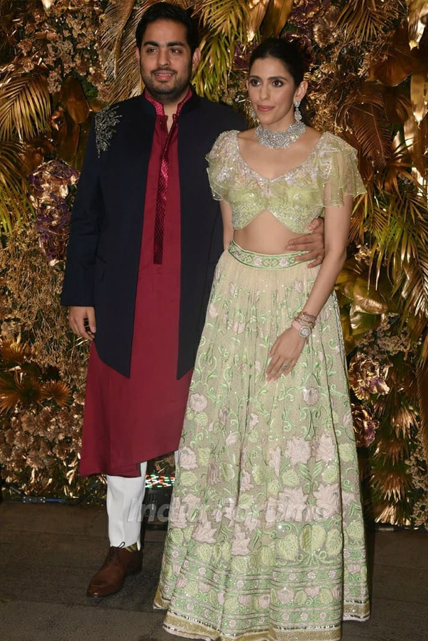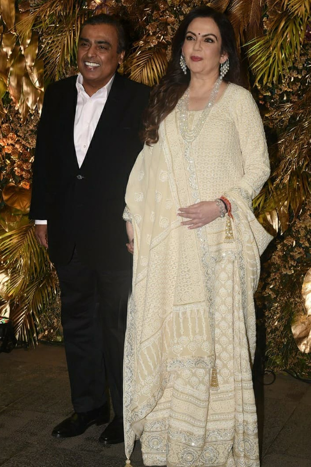 Shloka Mehta and Neeta Ambani chose patel outfits while Akash Ambani and Mukesh Ambani chose contrasting black outfits.