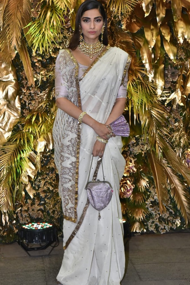 Sonam Kapoor wore a couture ivory saree from Good Earth while father Anil Kapoor arrived in a black flared kurta set.
