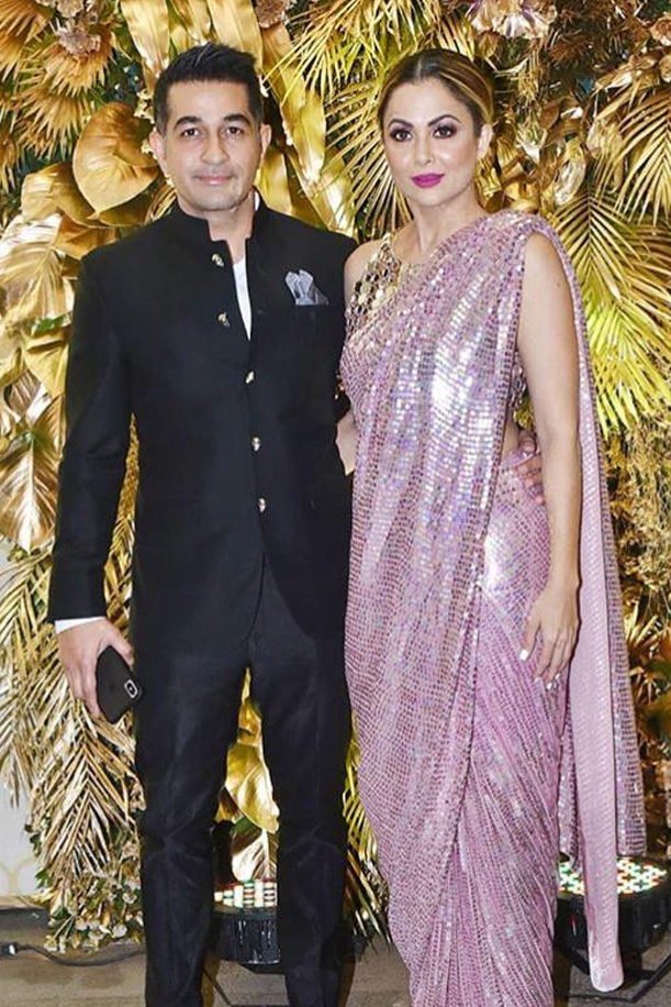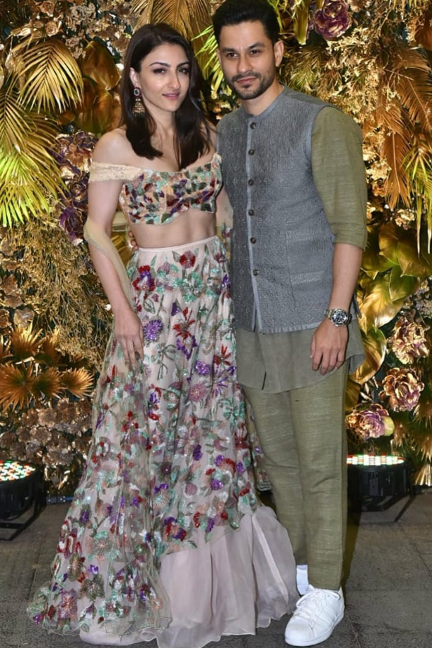 Soha Ali Khan Pataudi wore a dreamy floral lehenga by Shehla Khan and hubby Kunal Khemu looked dapper in an olive and grey kurta and bandi by Kunal Anil Tanna. Amrita Arora looked glamorous in a pink sequin saree as she walked in with husband Shakeel Ladak.