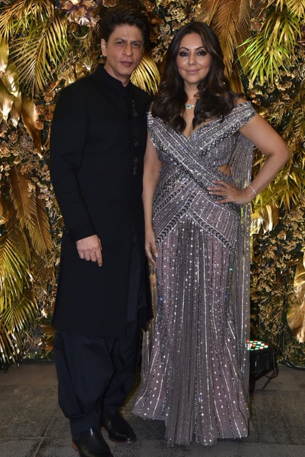 Shahrukh Khan arrived in a rich black outfit with wife Gauri Khan who wore a grey shimmery gown for the sangeet.