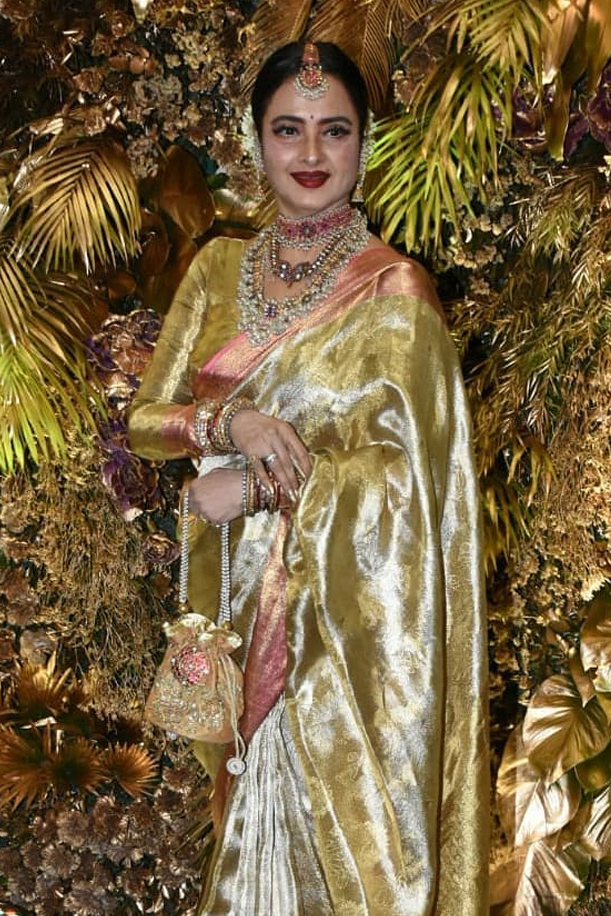 Rekha made a statement once again in a gold saree while Tara Sutaria wore an embellished ivory lehenga.
