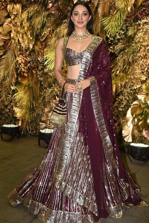 Kiara Advani arrived in a maroon shimmery lehenga by Manish Malhotra. Ananya Panday chose a sequin gold and ivory lehenga by Kresha Bajaj for the sangeet.