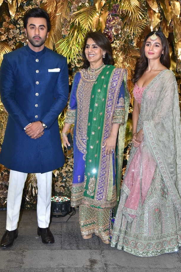 Ranbir Kapoor, Alia Bhatt and Neetu Kapoor arrived as family with Alia wearing a pastel Manish Malhotra lehenga.