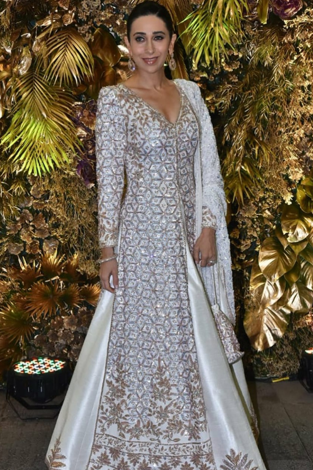 Armaan Jain’s cousin sisters Kareena Kapoor Khan and Karisma Kapoor both wore muted grey and ivory outfits by Manish Malhotra.