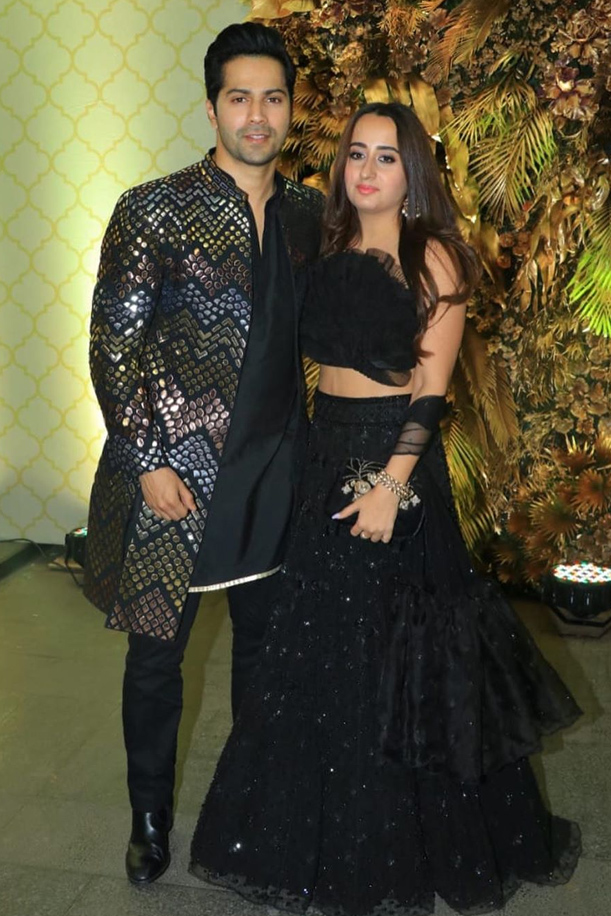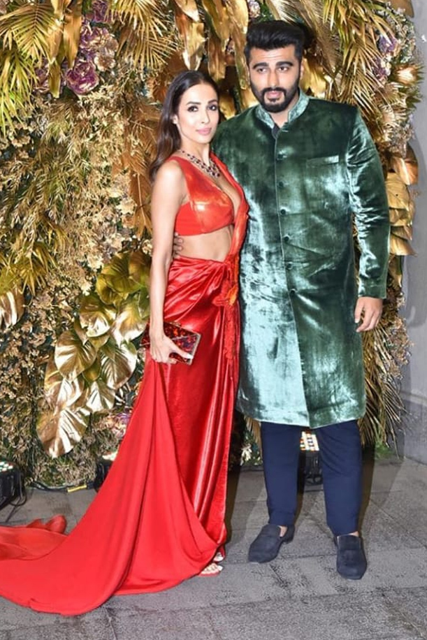 Malaika Arora walked in with Arjun Kapoor wearing a gorgeous red slit saree by Amit Aggarwal while Arjun chose a green velvet sherwani by Manish Malhotra. To-be-weds Varun Dhawan donned a black Abu Jani Sandeep Khosla sherwani while Natasha chose a stunning outfit from her own label