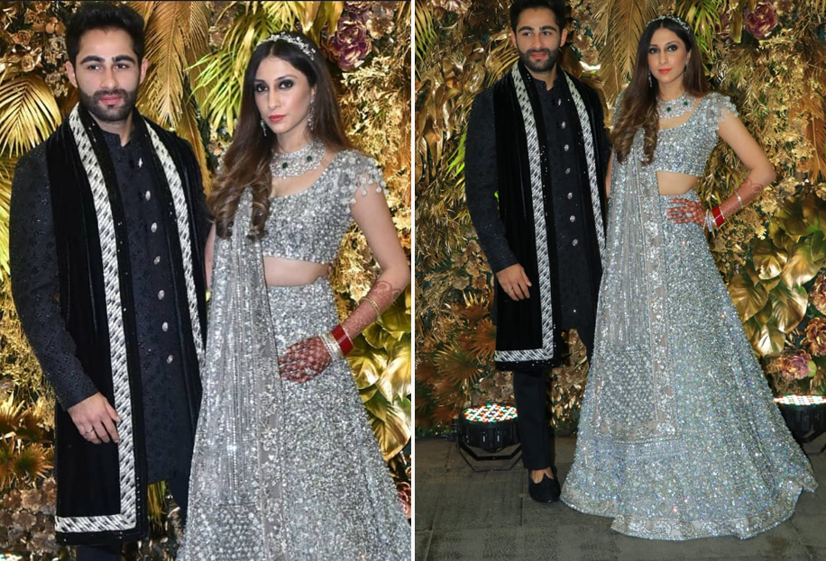 Armaan Jain wore a black bandhgala with matching black velvet stole. Anissa Malhotra wore a shimmery silver lehenga by Manish Malhotra which she paired with a diamond choker, earrings and headgear.