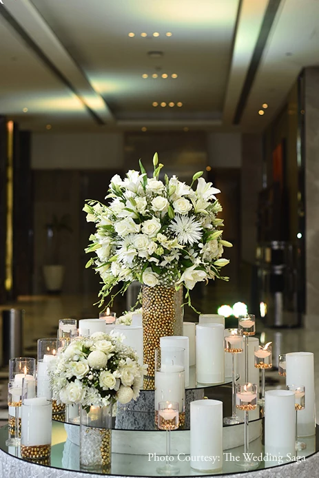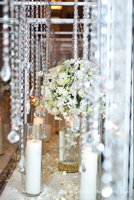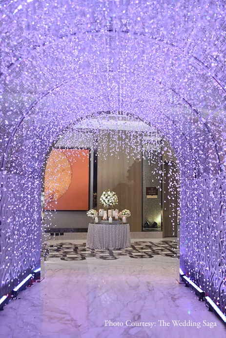 A shimmering tunnel of lights welcomed guests to the Reception festivities in the Grand Ballroom of Conrad Pune, where a dazzling confluence of white flowers and crystals awaited them. The elegant all-white dining set up was highlighted with a mix of simple and elaborate floral centerpieces as well as glass candle votives. Additional glass structures laden with candles and cascading crystals anchored the walls and other spaces in the venue.