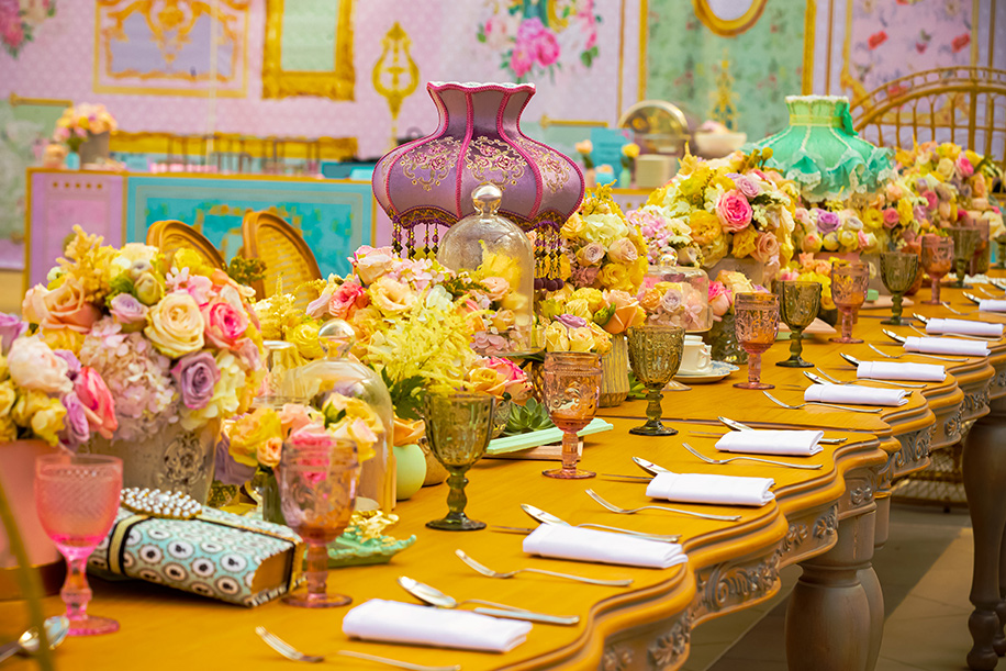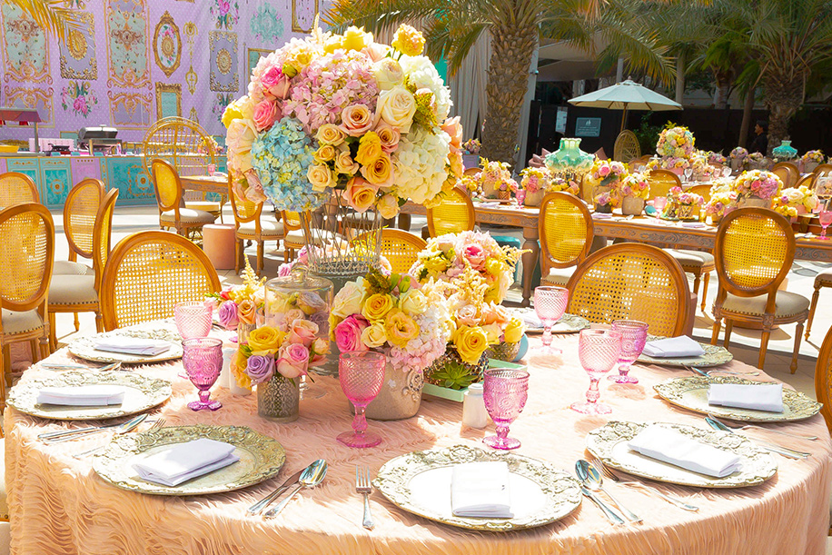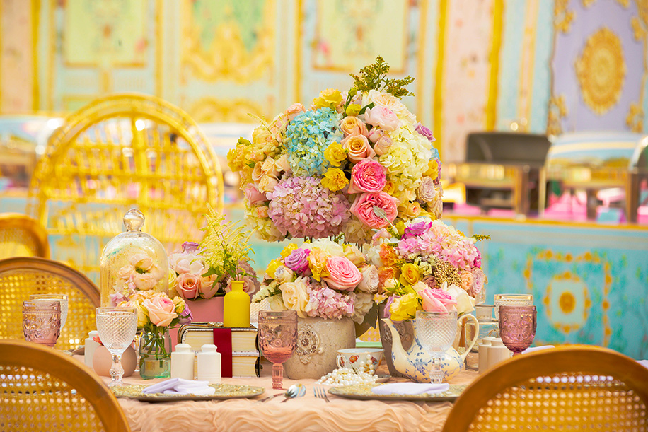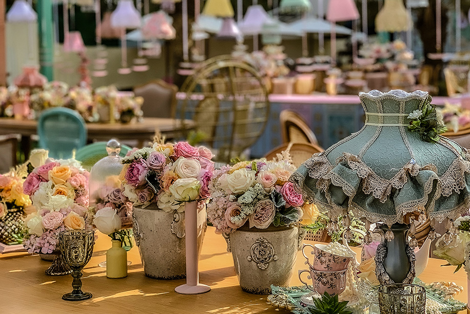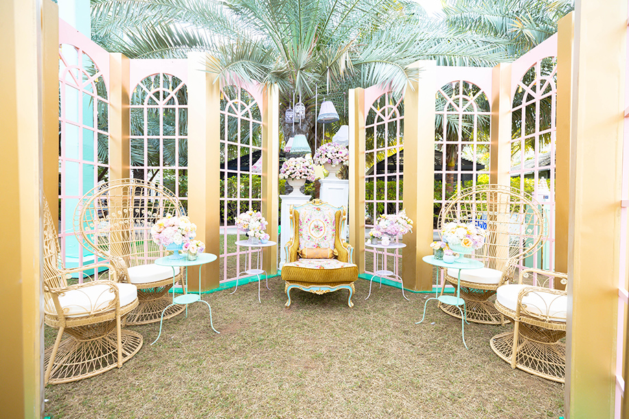 Keeping the theme in mind we used pastel-colored lamps and cake charlie’s in abundance along with an interesting mix of furniture like the Dior cane back chairs, pouffes and crown chairs that added a tinge of antique charm. And then our favorite part was the flowers! We used a wide range of exotic pastel flowers in volumes at various locations thereby making it a perfect shabby chic.