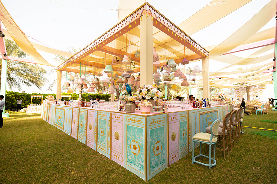 Being a day event and with the bright sun right above us, we decided to get a little playful with the signature Amaahyaaj drapes in light hues. The décor was functional wherein the bar and the food buffet were also dressed as per the theme. Different experiences like an exclusive bridal seating and a cake charlie installation were the star attractions. The bride’s love and passion for food were put on display through the intricate décor at the food buffet section. Additionally, the tables were adorned with an interesting mix of books, lamps, shells, pearls and other elegant elements that looked beautiful under the sun.