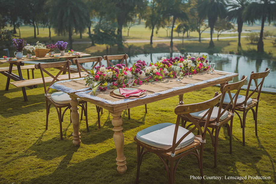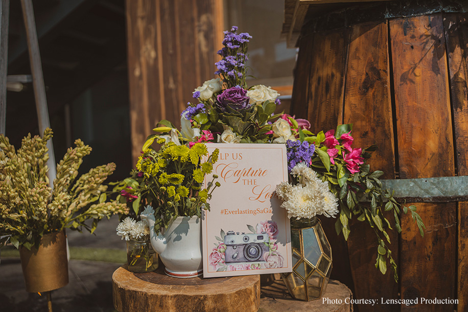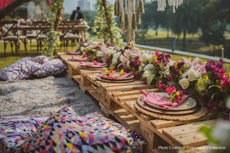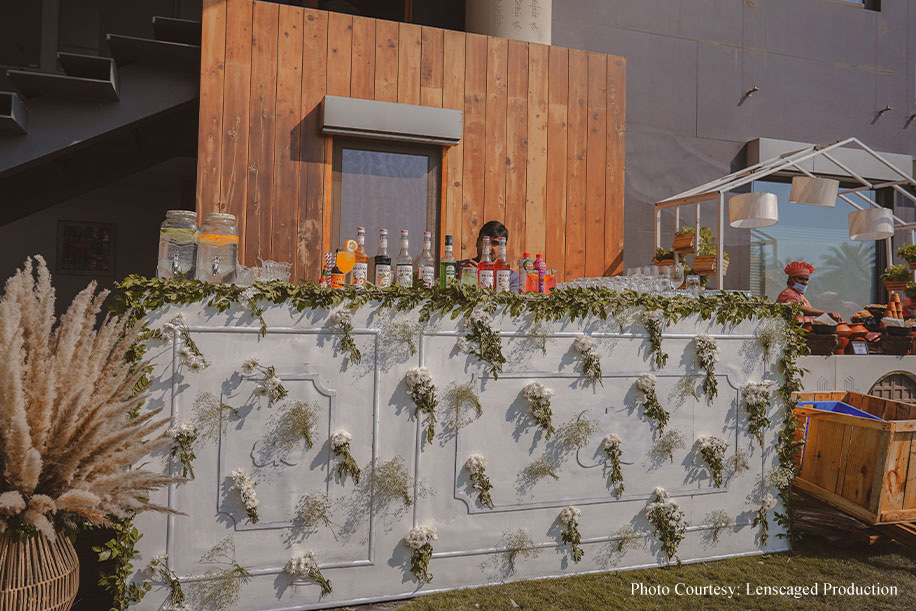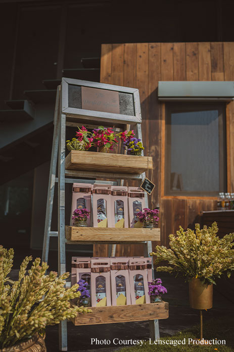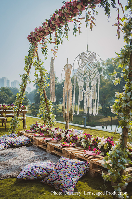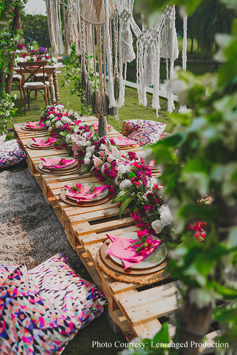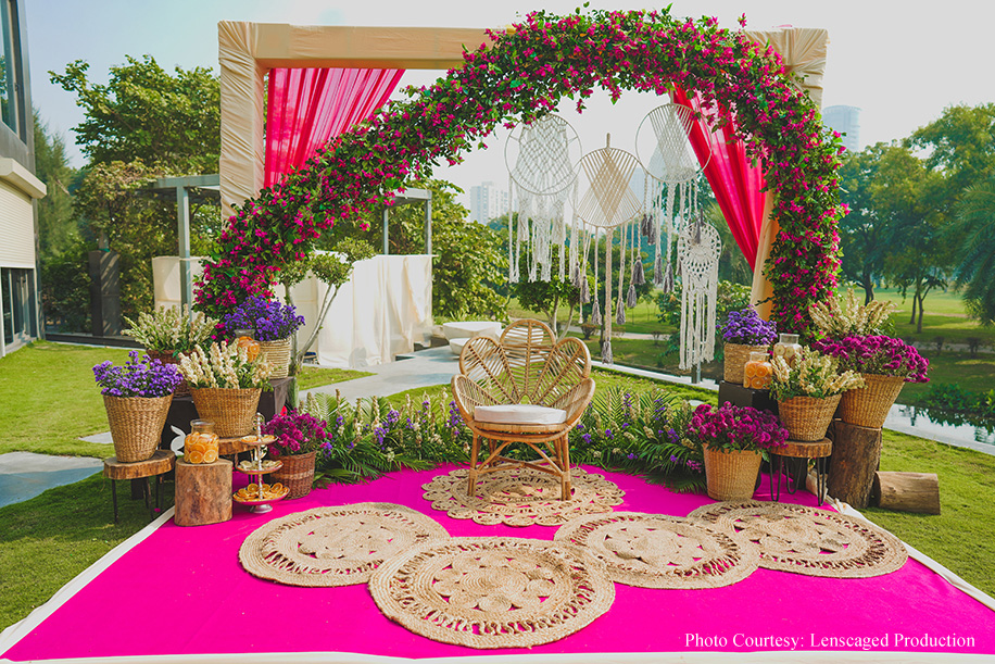 Hosted beside the serenity of a pond, the Mehndi soiree evoked the allure of a spring picnic. Baskets of brightly colored flowers, rustic decor corners, wooden tables, macrame art, and more added to the refreshing ambiance. Designed with a striking floral installation, the bridal corner stole the show.