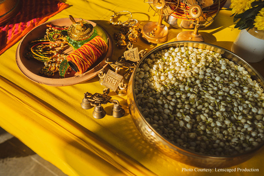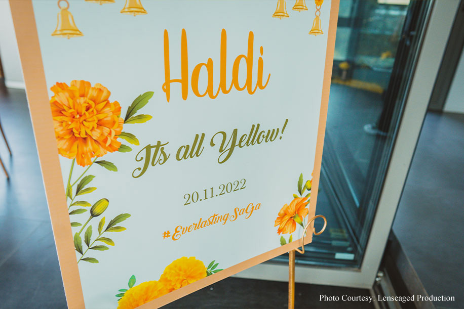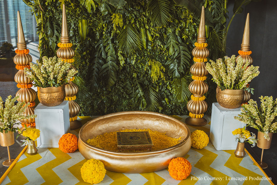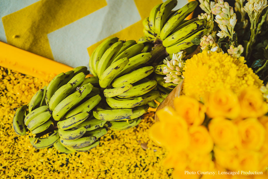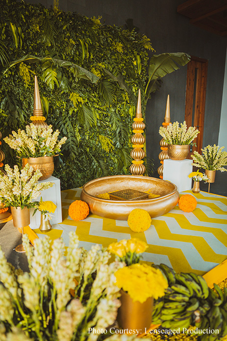 Imagined with lush natural decor, the Haldi ceremony was the perfect blend of traditional and eclectic. Bright marigolds were balanced with the earthiness of banana leaves and exotic greens, and the sheen of brass elements, while stacks of green bananas and more added a unique Indian touch.