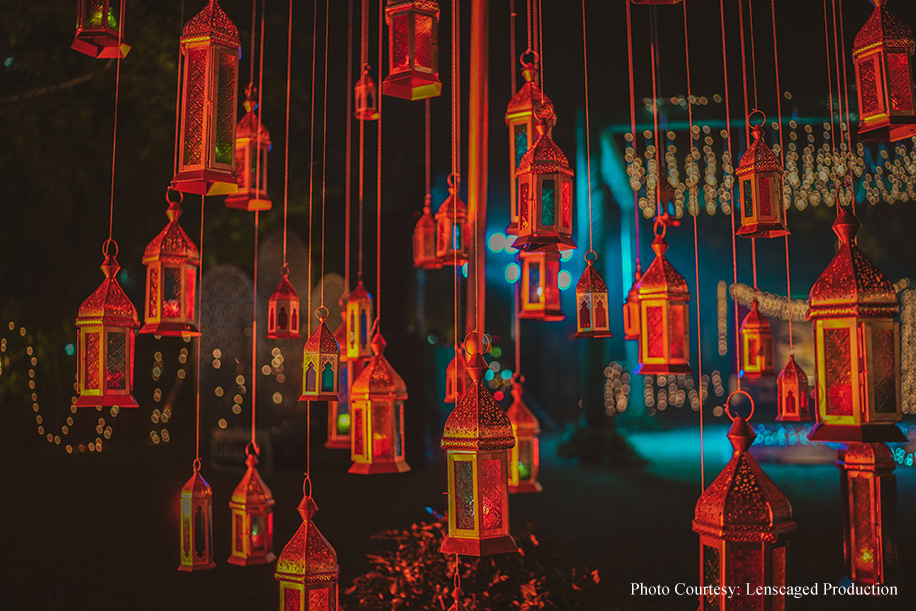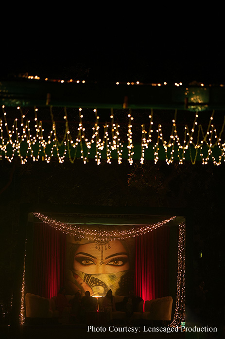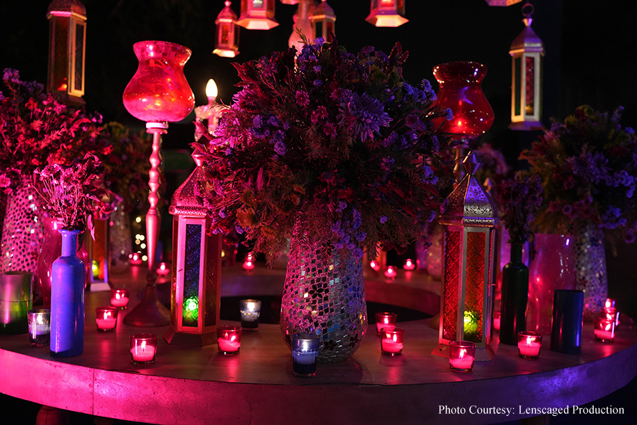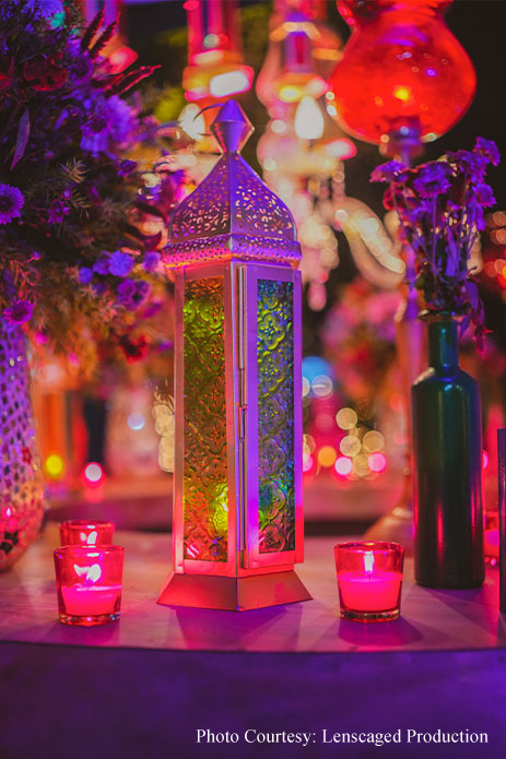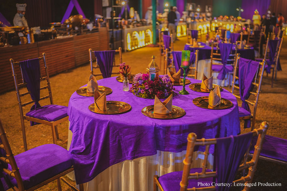 Imbibed with a Turkish theme, the Sangeet night was steeped in decadence and wonder. An exquisite tunnel of Turkish arches led into the festivities, while plush purple velvets, exuberant floral art, rich lighting, and artistic decor corners and elements all came together to create the magical night. The bride flaunted a stunning net saree with a velvet cape, while the groom wore a beautifully patterned kurta and jacket set.