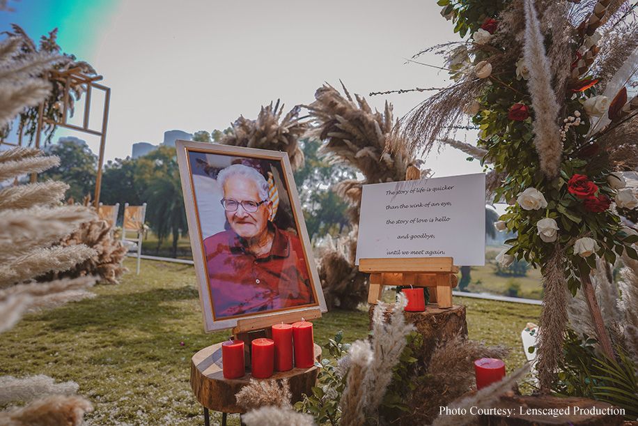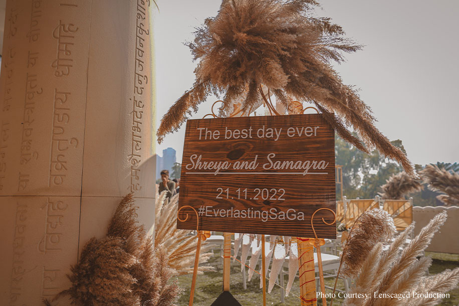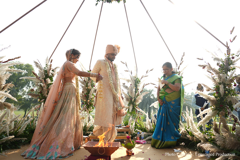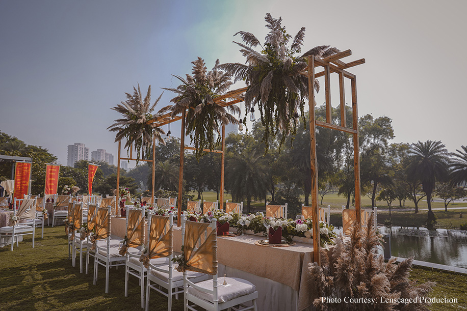 The tranquil outdoor wedding was designed with the theme of Winter Pampas, rustic yet undeniably elegant. Imagined in an earthy palette of soft creams and white, the decor saw an abundance of pampas grass for a breezy, boho feel, complete with white blooms and pops of red. The unconventional mandap and the heartwarming family corner to honor loved ones who had passed away added memorable touches to the occasion. The bride and groom matched the vibe with their outfit choices and were wed by a female priest in a ceremony that was unique, empowering, and absolutely beautiful.
