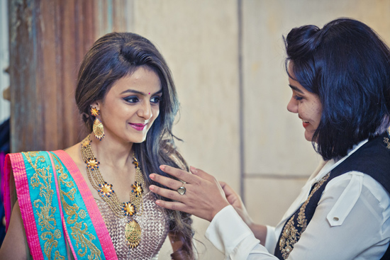 “From the moment I walked in to Jade I felt very welcome and comfortable. I was pleased to meet the WeddingSutra team in person, since I have been following their Facebook page www.facebook.com/weddingsutra for so many months. They introduced me to the three specialists they had invited for this event, well-known Stylist Nisha Kundnani, Makeup Artist Amrita Sanghavi and Candid Photographer Dev Purbiya. The session start with a consultation with Nisha Kundnani. What I loved most about her is the time she spent to understand my tastes and styles. While talking to her I didn’t feel I was having a ‘consultation’, it was all so relaxed and her sense of humor put me at ease. Nisha shared a lot of tips on what I should remember while shopping, and what suited my body type and skin tone- the colors, the embroidery styles and the silhouettes.