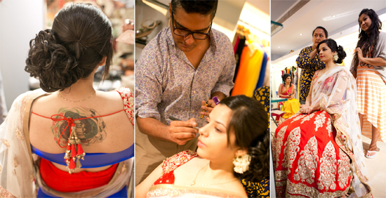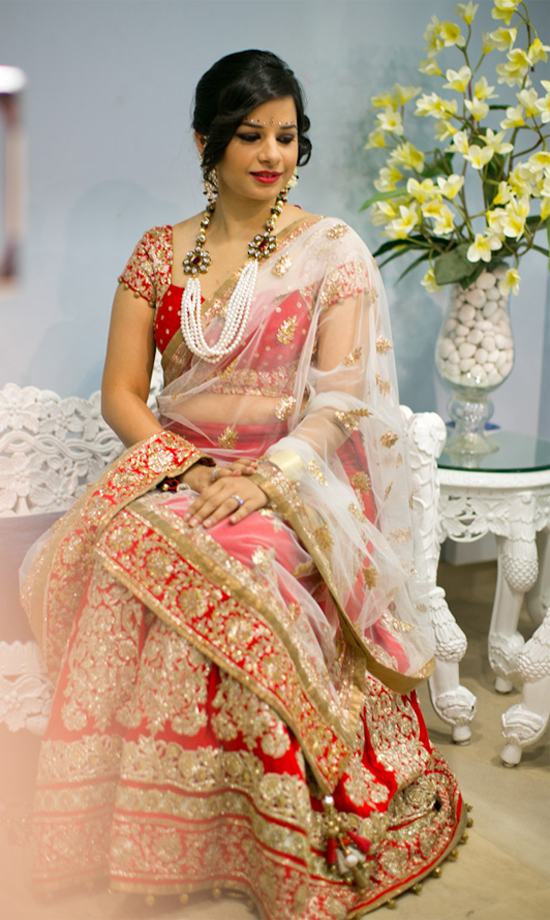 “The moment my wedding date was fixed, I couldn’t stop thinking about what needs to be done; while the arrangements and events bit is something which is keeping me and my family busy, what kept me most preoccupied was thinking about what to wear and where to shop, and I didn’t know where to start. A friend suggested I check the album ‘Lehenga LookBook’ on WeddingSutra’s FB page. I loved the album but I still couldn’t figure out what I should wear. I’m a jeans and tee girl, so I haven’t really bought too much Indian wear, and I was confused whether I should go very traditional, or pick something contemporary Indian. One day when I was browsing through the WeddingSutra blog, I read about ‘WeddingSutra on Location’ and immediately dashed off an email to tell them how eager I was to be a part of it. I was selected and super excited. On the day of the event, when I entered Fizaa, I was overwhelmed to see the variety of colors and styles in Indian wear. After I met all the experts, stylist Sakshi Mehra suggested I try a Shyamal & Bhumika lehenga- red and white with intricate gold and silver work, with a white and gold dupatta. I loved what I saw in the mirror and decided to go with it. For Makeup Kumar Iyer asked me what I wanted– and here I was a little clear, I wanted to look like a Gujarati bride, but with light and natural make-up, Kumar smiled and nodded, and I was reassured that he knows what I want. Hair Stylist Ishita Khanna gave me a fabulous side bun with few flowers to complete the look. During the photo shoot I was a little conscious, but Shreya Sen made me comfortable while she clicked away. Oh, I never knew a photo shoot could be so much fun! I walked out of Fizaa happy that I had learnt so much about clothes, make-up and hairstyling in three hours.”