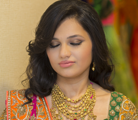 I reached Neeta Lulla’s Studio at the scheduled time, 11:00 am, very excited, but also a little unsure and nervous. I met the WeddingSutra team, and all my doubts disappeared once they introduced me to the warm and friendly experts they had invited. Neha Shroff, the Wedding Planner, first helped me look at Neeta Lulla’s bridal line. I told her I wanted to look like a traditional bride, and wear something a bride would wear for the wedding ceremony. After trying a few options I decided to wear a pink lehenga with gold vintage embroidery teamed with a green brocade choli. We then looked at the exquisite Jewellery collection from Azva, and with Neha’s suggestion, I wore a chunky necklace with a set of bangles for a ‘heavily adorned bride’ look.