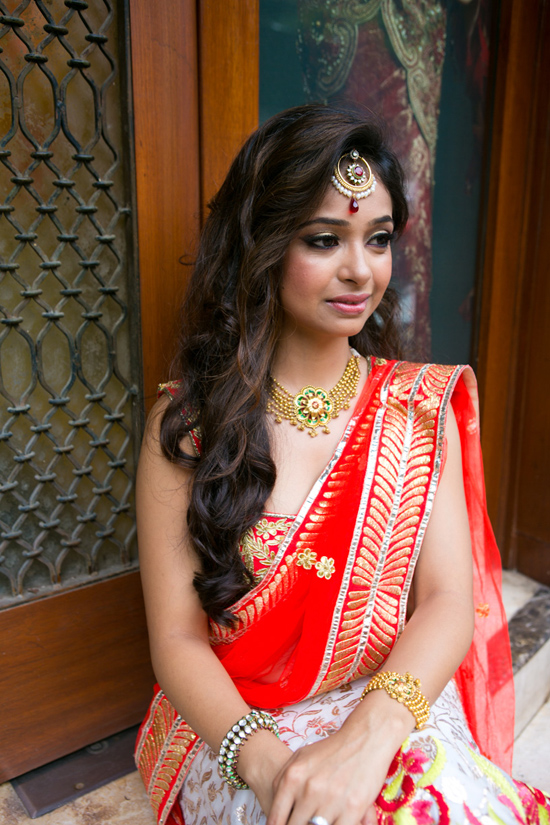 Getting my makeup and hair done was the next step. Makeup Artist Ojas Rajani and her team, took their time to give my hair a life of its own. I loved the subtlety, the natural bounce and the waves they created– while still maintaining the length. Ojas herself did a splendid job with make-up! I loved sitting in front of the mirror watching the whole process as she worked through my base, then artfully the eyes, the cheekbones and lips. Ojas then draped and styled my outfit and Neha accessorized my look with traditional gold jewellery. Once I saw my final look, I was overjoyed! I felt beautiful, confident and content.